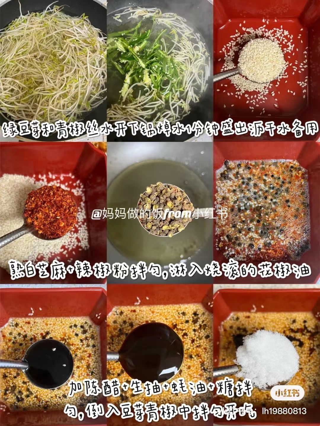 食材:调料勺子直径4CM 300g绿豆芽,3颗青椒,2勺熟白芝麻,2勺辣椒粉,2勺生抽,1勺陈醋,1勺蚝油,半勺糖,1勺花椒粒 ①300g绿豆芽和3颗青椒丝水开下锅焯水1分钟盛出沥干水备用。 ②2勺熟白芝麻+2勺辣椒粉拌匀,油热加1勺花椒粒,炒滚烫,淋入芝麻辣椒粉中,拌匀。 3加1勺陈醋+2勺生抽+1勺蚝油+半勺糖拌匀。
