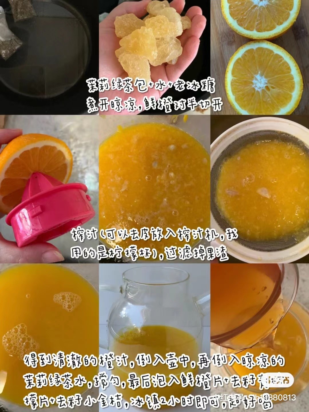 食材:鲜橙7个,茉莉绿茶包3包(每包2g),老冰糖150g,清水1600g,青柠檬1个,小金桔6个 提示:壶是1800ml,以上份量可制作2L(一家人一天的份量) 做法: ①3包茉莉绿茶包(每包2g)+150g老冰糖+1600g清水大火煮开,转最最小火焖煮10分钟,关火再焖5分钟,让茶包充分溶解,晾凉备用。 ②6个鲜橙榨汁(榨汁机去皮榨汁,我用的柠檬杯不用去皮) ③得到的橙汁过滤掉果渣,得到清澈的橙汁,倒入壶中。 ④再倒入