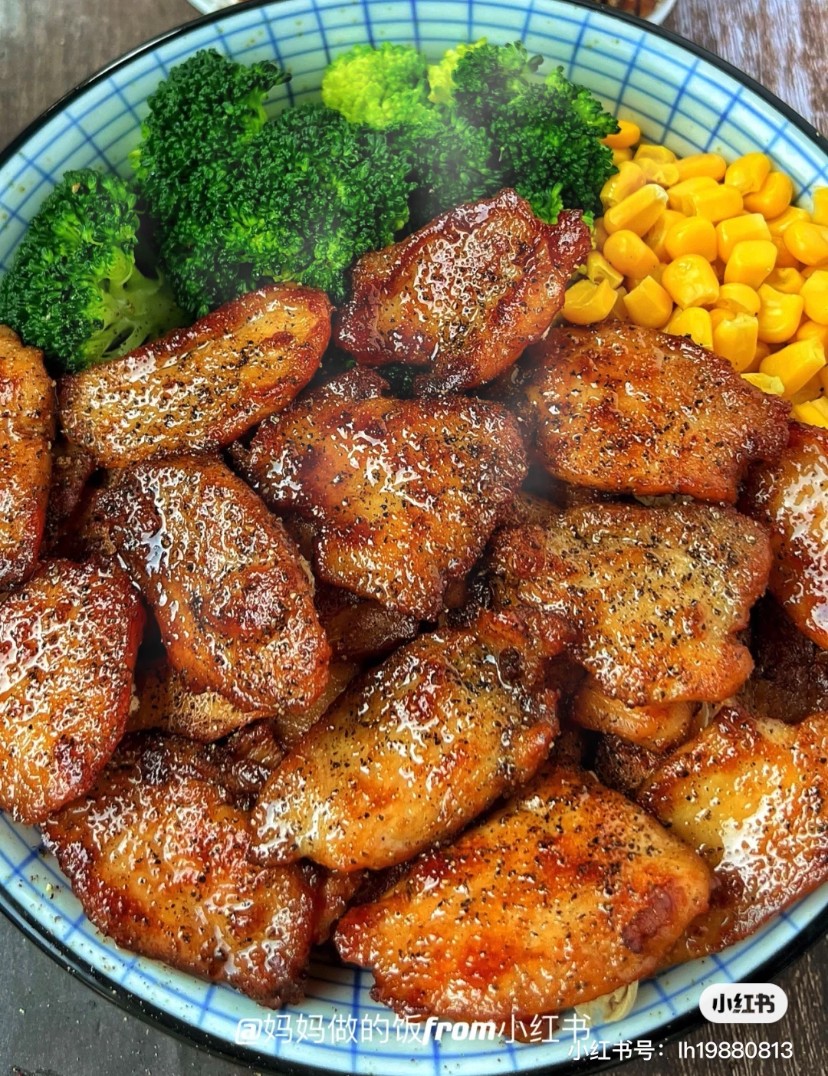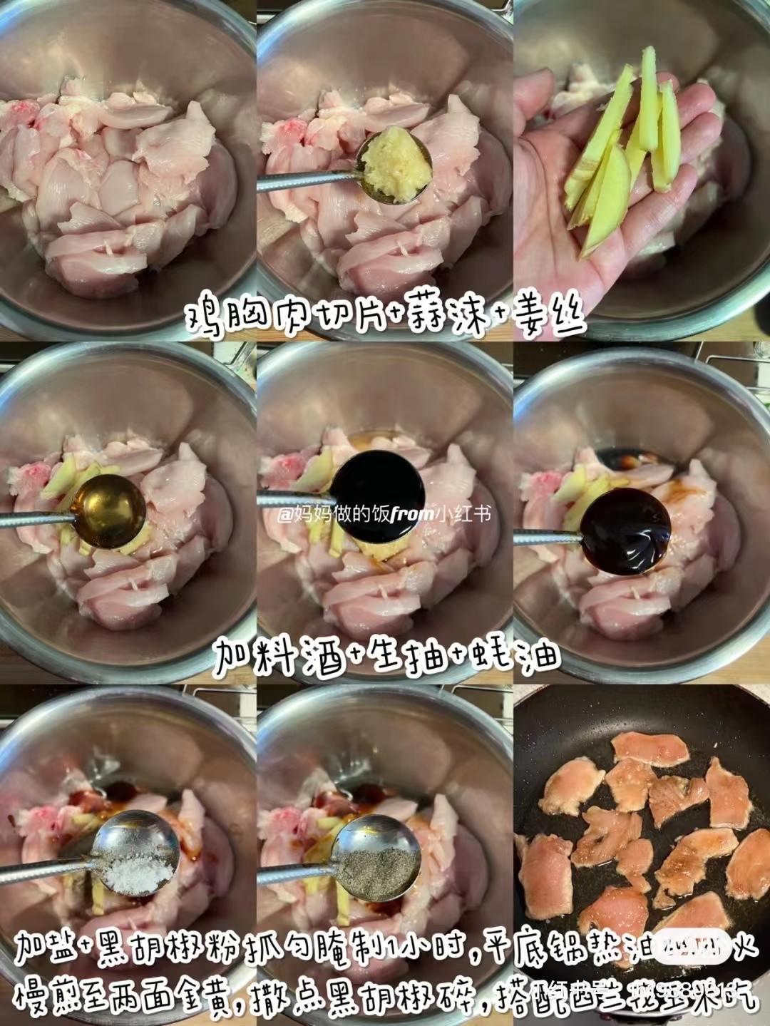 食材:调料用的是4CM直径的圆勺。 1块鸡胸肉,10根姜丝,1勺蒜沫,半勺黑胡椒粉,1勺料酒,三分之一勺盐,1勺蚝油,1勺生抽,柠檬海盐黑胡椒碎,半颗西兰花 做法: ①1块鸡胸肉切薄片+1勺蒜沫+10根姜丝+1勺料酒+1勺蚝油+1勺生抽+半勺黑胡椒粉+三分之一勺盐抓匀,常温腌制1小时。 ②平底锅多刷点油,平铺鸡胸肉,Zu小火慢煎至两面金黄即可。装盘撒点柠檬海盐黑胡椒碎。 3水开下西兰花玉米,煮2分钟捞出。一顿低脂低卡好吃不胖的营养餐就做