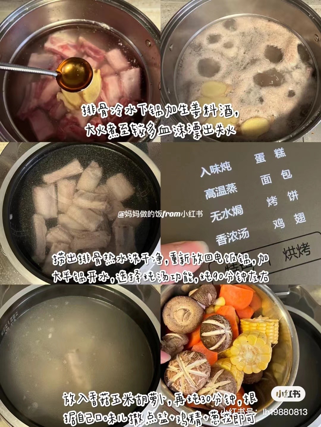 食材:4CM圆勺 500g猪排骨,10片生姜,1勺料酒,开水,5朵香菇,1根玉米,1根胡萝卜,适量盐,适量鸡精,适量葱花 做法: ①500g猪排骨洗干净,冷水下锅,加5片生姜+1勺料酒,大火煮至较多血沫漂出即可关火,捞出排骨用较热的水洗干净。重新放回电饭锅中,加大半锅开水+5片生姜。 ②选择炖汤功能,炖大约90分钟。 ③加入自己喜欢的配菜(5朵香菇,1根玉米,1根胡萝卜),继续炖30分钟,根据自己口味儿撒点盐+鸡精+葱花。