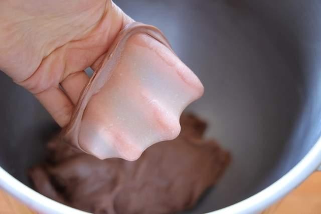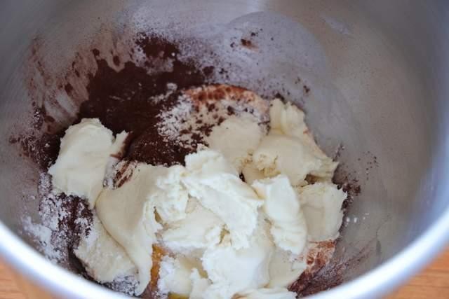 把除了巧克力和黄油之外的材料放在面桶里,中种面团切块也一起加进去;