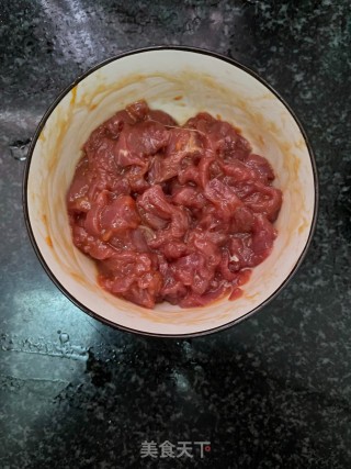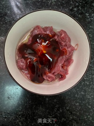 牛肉放入碗中,加入适量蚝油,玉米淀粉,花生油。