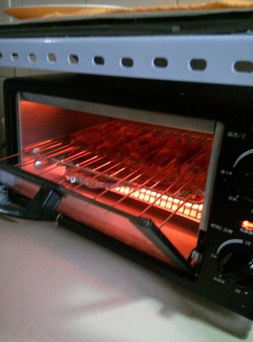 上下火中层烤15分钟左右,中途取出刷上油+孜然粉+辣椒粉的混合调料,并翻面~
