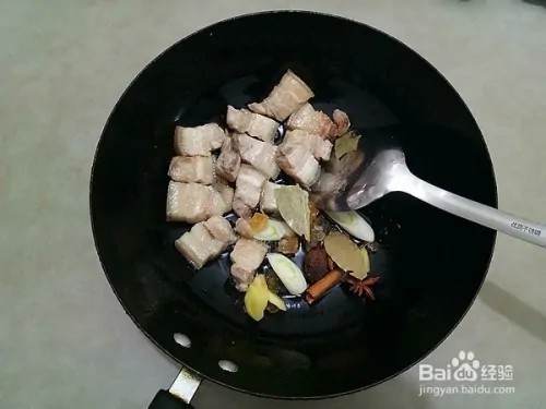 炒出调料香味,冰糖融化五花肉稍稍上色,加入红烧酱油翻炒均匀