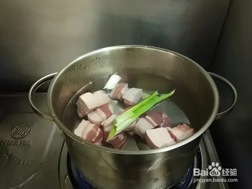 五花肉切麻将块冷水下锅,加入葱段、姜片、料酒大火烧沸。水沸后撇去浮沫