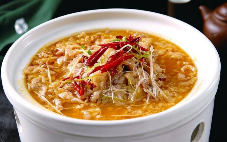下入蒜泥、葱段、姜片、黄灯笼辣椒酱、野山椒煸炒出香,冲入鸡汤700克,加白醋、盐、鸡精、味精调味,大火烧开。