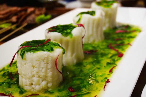 将青菜和山药蒸熟,加上调配好的佐料