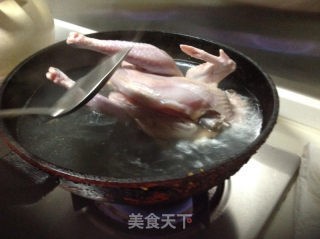 鸡放入开水里焯烫,鸡太大,可以用勺子舀开水往鸡身上浇