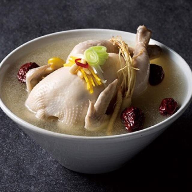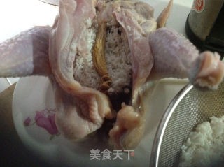 鸡肚子装入一半泡好的糯米,再放入人参,再放上一半糯米,用牙签将鸡肚扎紧