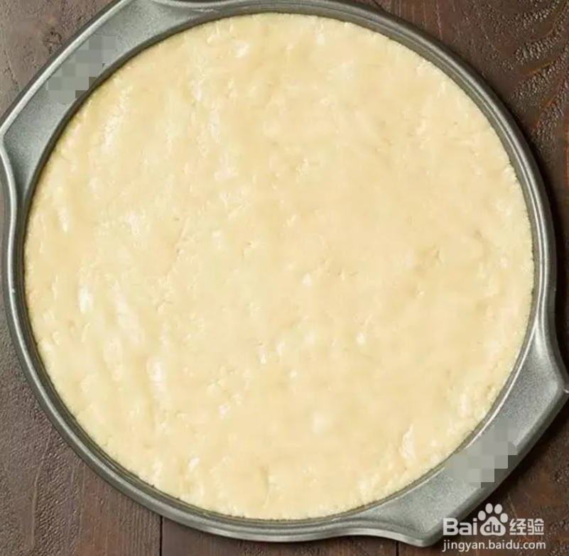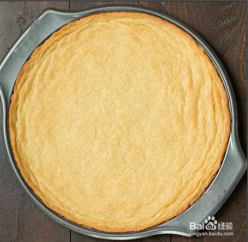步骤一、烤箱预热到190度, 准备一个12寸披萨锅,把饼干面团放在上面,然后一层一层铺好,完全覆盖平底锅,烘烤14 - 13分钟。