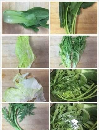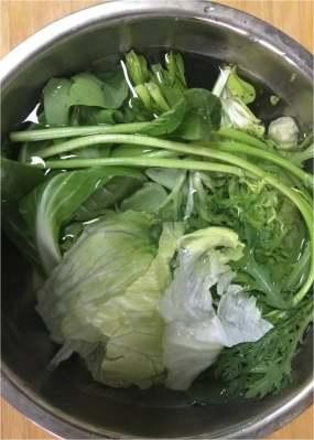 先把需要的蔬菜都准备好,取适当量放入盆内,取适量食用碱加入洗菜盆泡10分钟