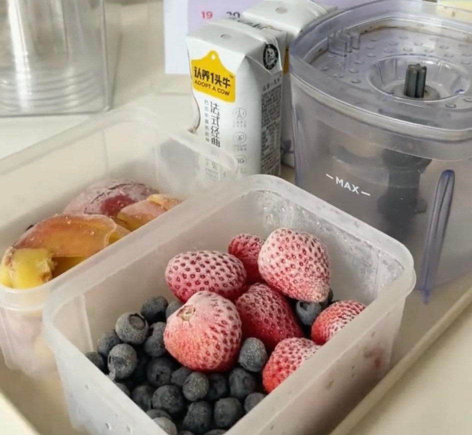 将冷冻水果放入料理机中,再加80毫升椰奶,搅拌至弄浓稠状