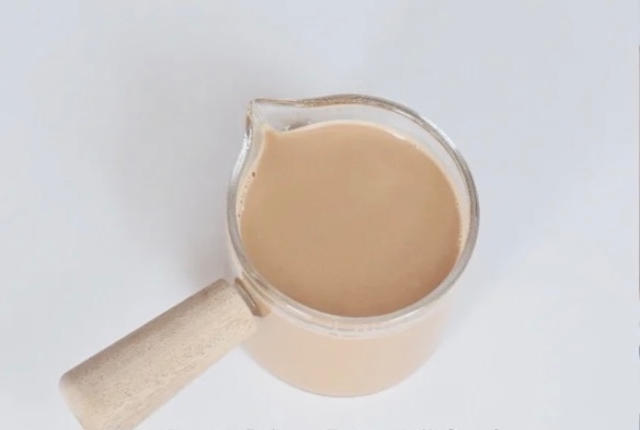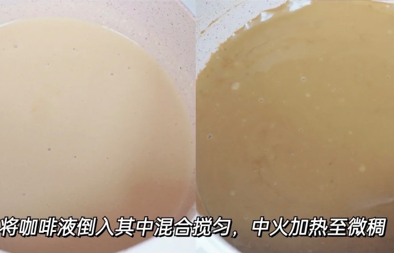 将咖啡液倒入其中混合搅匀,中火加热至微稠