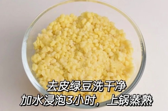 把去皮绿豆洗干净,加水浸泡3下时,上锅蒸热