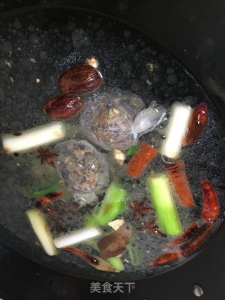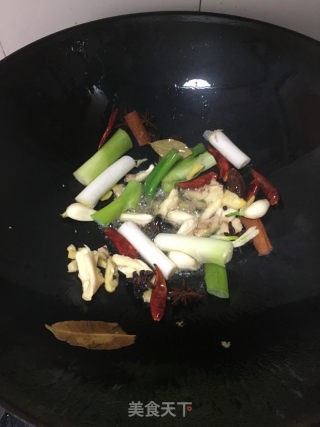 先爆香(蒜头,姜,干辣椒,花椒,草果,香叶,桂皮)注:爆炒香料前,先把鸽子过一下温水,去血腥。
