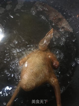 待油温发出吱吱响后(100度以上)把鸽子先全方位炸几分钟后,捞起,待两三分钟后,又炸(这样的步骤反复两三次)。