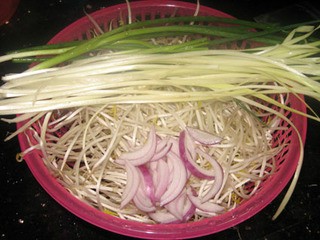将绿豆芽、韭黄、洋葱、香葱洗净。