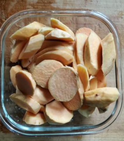 小番薯削皮洗净切薄片放入玻璃碗中,放入高压锅中压10分钟