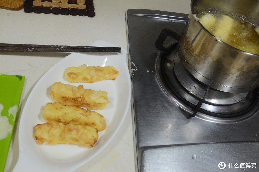 然后将裹好的牛奶糊放入锅中炸至表面金黄。这个过程我建议牛奶一个个分开裹,裹好就放入锅中,不要一次性全部裹好再放。