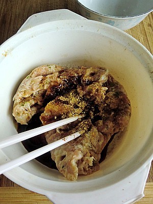 肉馅加入酱油,白糖,料酒,盐,胡椒粉,鸡精,香油拌均匀。