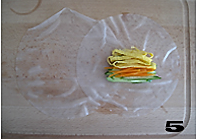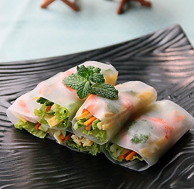 米纸用温水泡软,1—2分钟即可。(浸泡时间过长或水温过热会使米纸破碎。)取出泡好的米纸皮,将薄荷叶、虾仁、黄瓜丝、鸡蛋丝、胡萝卜丝、生菜放入其中。沿着底端向上卷起,切掉左右两端多余米皮,露出蔬菜蛋皮即可。依次制作摆盘。