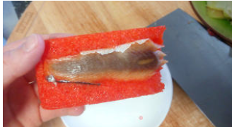 翻过背面来,把鱼子以外的东西去除,加鱼子重量2%的盐把鱼子捏碎,与盐充分混合,成为鱼子酱,(如果买不到新鲜鱼子或者嫌麻烦的,可以直接买处理好好的瓶装鱼子酱,直接就可以用的,)