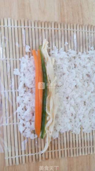 在卷帘上铺上一张保鲜膜,米饭均匀的扑在保鲜膜上,铺成长,(还可以在米饭上铺上一张紫菜,)胡萝卜条和黄瓜条、蛋片条放在米饭的一边