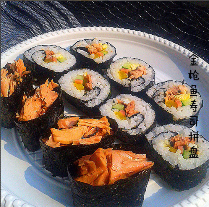 铺好紫菜,铺好一层米饭,将四种材料放在中下部分,最顶端少放点米饭。