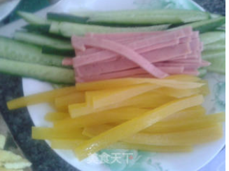 将黄瓜、火腿、黄萝卜切成条状。这种萝卜在网上都卖的。