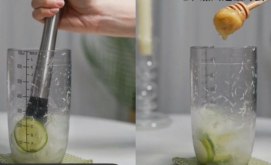 准备摇壶,放入切好的柠檬片,加入四五块冰块,用力捶打出汁后,加入蜂蜜