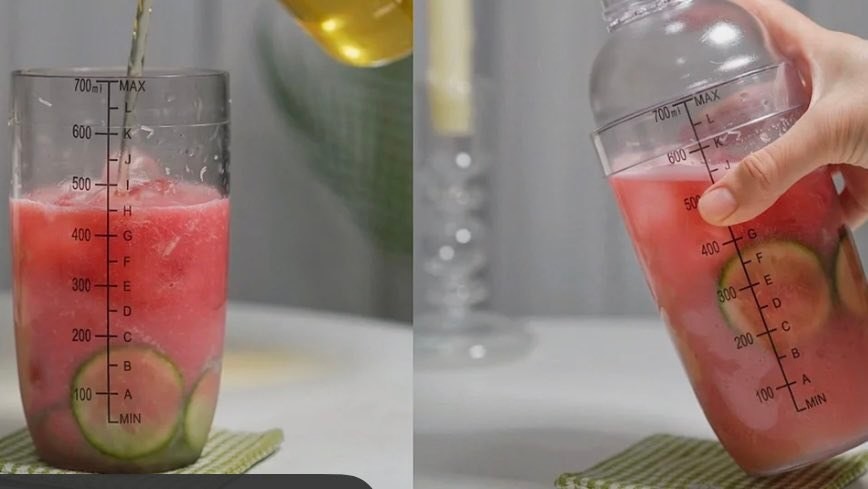 倒入榨好的芭乐果泥,加入冰块,倒入绿茶,盖紧摇壶摇晃均匀,最后倒入杯中中就完成了