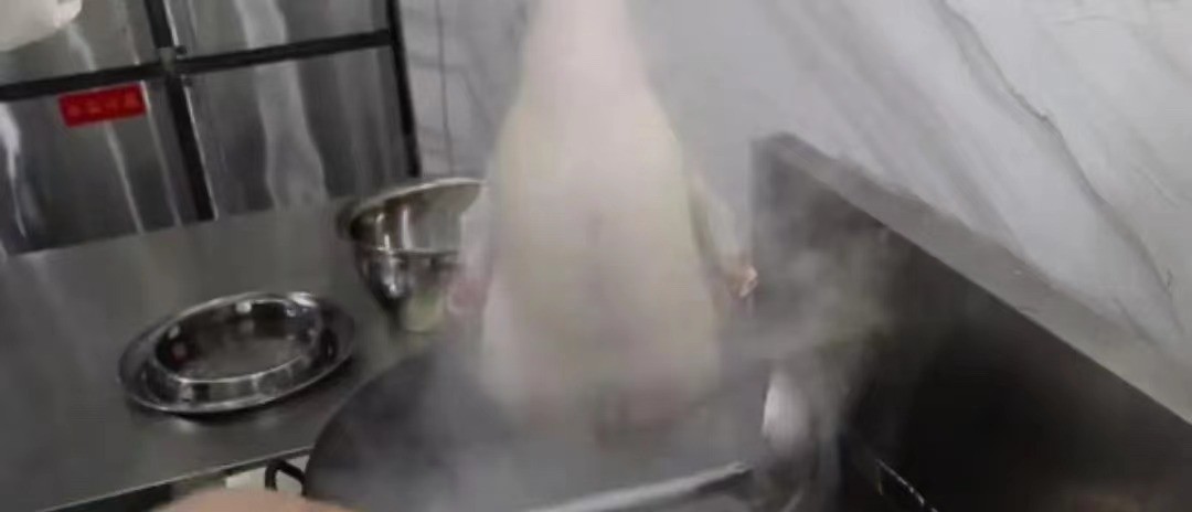 从鹅颈处充气,吹至鹅身表面发胀,起白色皮即可。烧开水放入己吹气的鹅烫皮,使表皮收紧,然后取出过冷水。