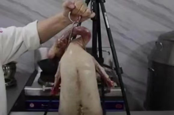 用烧腊钩把鹅挂好,让鹅身惊干水分,然后淋(烧鹅皮水)挂在风口处吹约3-5小时。