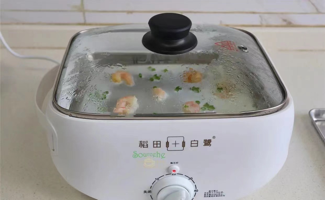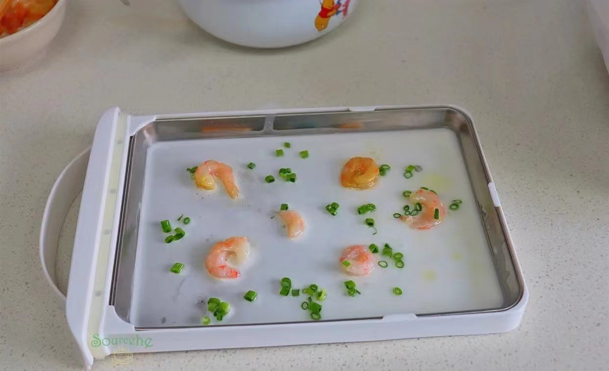 把蒸盘 放入锅,旺火蒸熟,即可取出。如何判断蒸熟,可以透过玻璃盖观察,看见浆糊上有泡冒起,就是蒸熟。