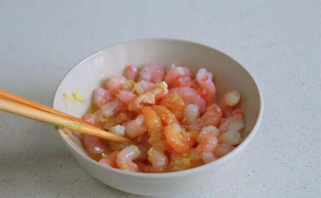 虾仁提前解冻,清洗干净,放盐、生粉、生抽、姜丝、花生油,搅拌均匀。我购买的是冷冻虾仁,如果是新鲜的虾,需要把虾壳、虾头、虾线,去掉,然后清洗干净。