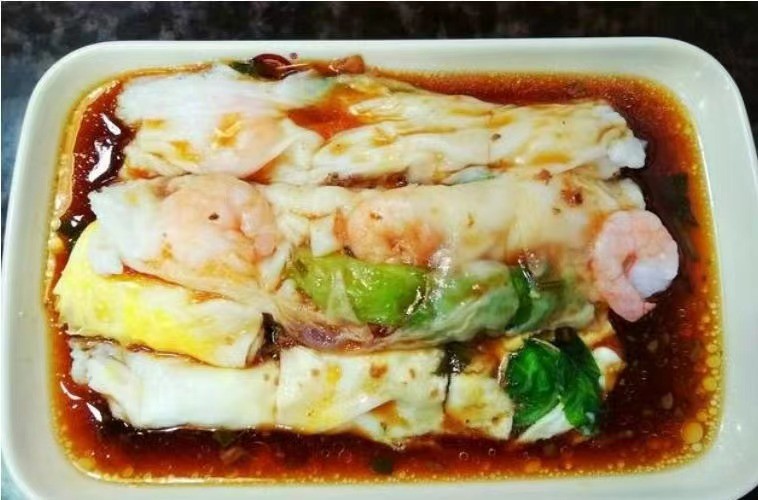 蒸熟取出,用刮板从蒸盘的一头卷起至另外一头,装入盘子,吃的时候浇上肠粉专用酱油,喜欢的还可以搭配生菜、菜心、芝麻等。
