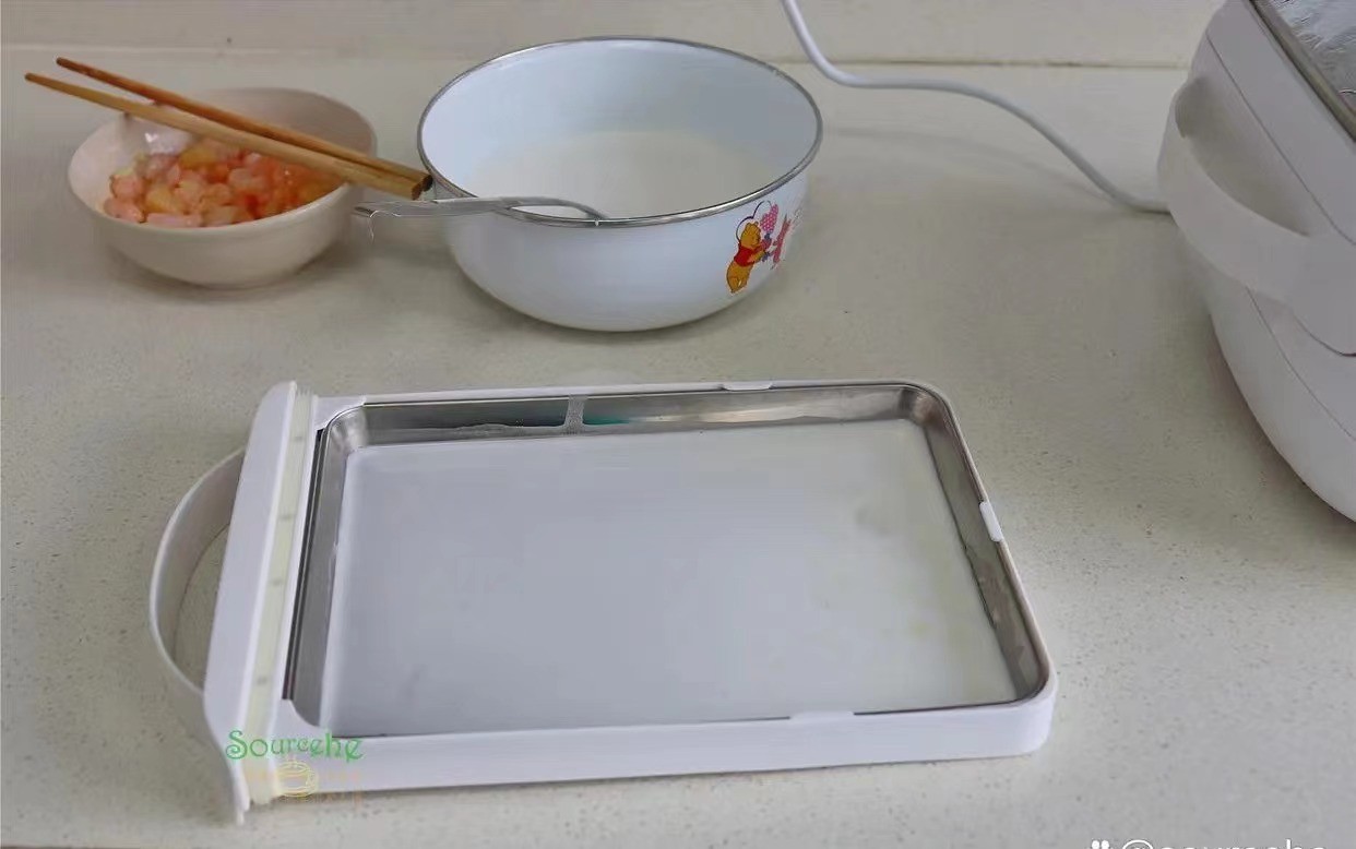 肠粉机(也可以是蒸锅,)放入蒸盘,蒸热取出,在蒸盘上涂抹一层花生油,倒入一层薄薄的米浆。