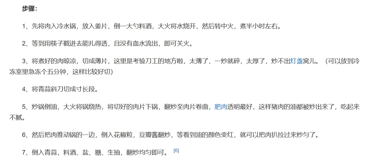 步骤: 1、先将肉入冷水锅,放入姜片,倒一大勺料酒,大火将水烧开,然后转中火,煮半小时左右。 2、等到用筷子戳进去能扎得透,且没有血水流出,即可关火。 3、将煮好的肉晾凉,切成薄片,这里是考验刀工的地方啦,太薄了,一炒就碎,太厚了,炒不出灯盏窝儿。(可以放到冷冻室里急冻个五分钟,这样比较好切) 4、将青蒜斜刀切成寸长段。 5、炒锅倒油,大火将锅烧热,将切好的肉片下锅,翻炒至肉片卷曲,肥肉透明最好,这样猪肉的油都被炒出来了,吃起来不腻。 6、然后把肉推动锅的一边,倒入花椒粒,豆瓣酱翻炒,等看到油