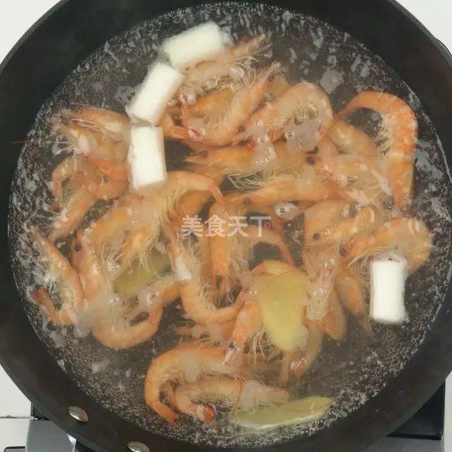 锅内加半大锅水,放入姜片、葱段、黄酒,大火煮开。倒入虾,略搅拌让虾受热均匀。水开后,再煮30秒,捞出。