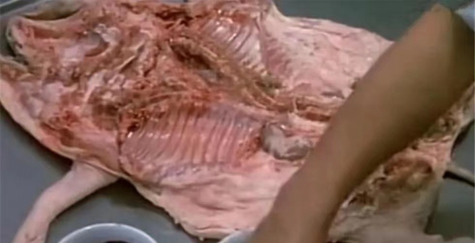 将净光乳猪从内腔劈开,使猪身呈平板状,然后斩断第三、四条肋骨,取出这个部位的全部排骨和两边扇骨,挖出猪脑,在两旁牙关各斩一刀。