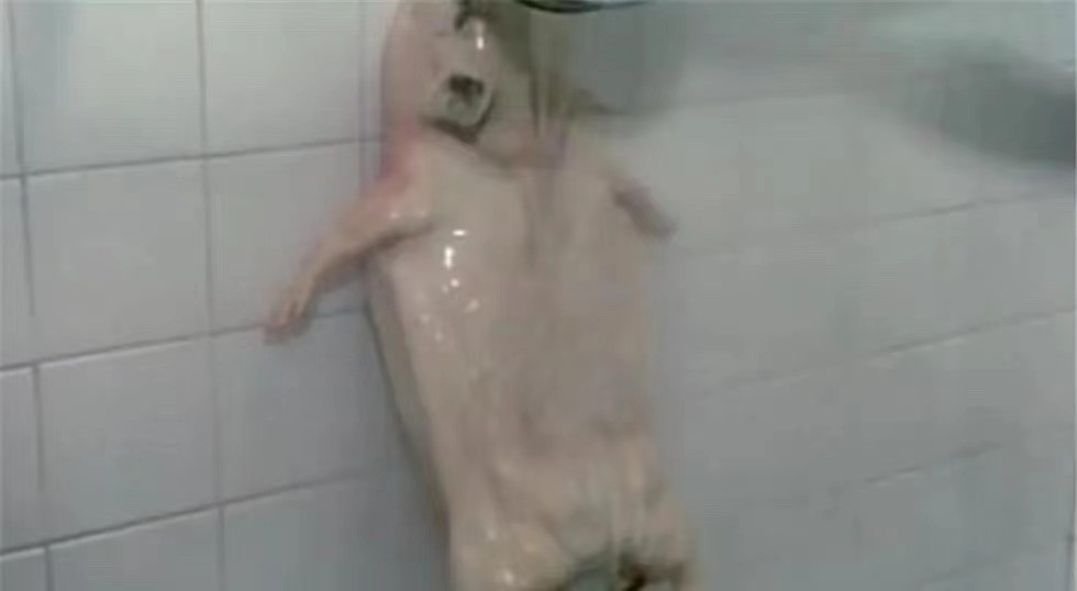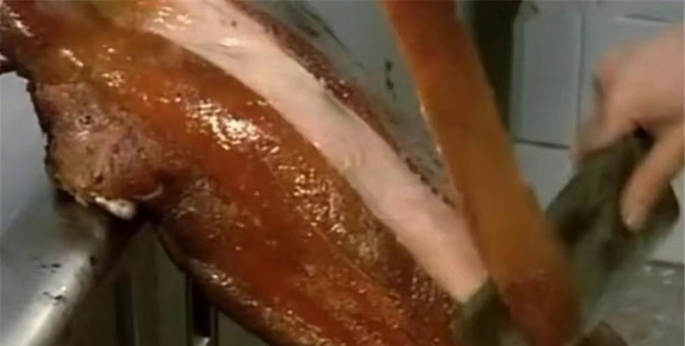 取125克香料匀涂猪内腔,腌30分钟即用铁钩挂起,滴干水分后取下,将除香味料及糖水外的全部调料拌和,匀抹内腔,腌20分钟后叉上,用沸水遍淋猪身使皮绷紧、肉变硬。