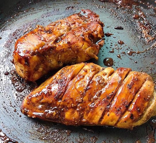 3、在平底锅中加热适量的植物油,将腌制好的鸡胸肉放入锅中,小火煎至两面金黄。