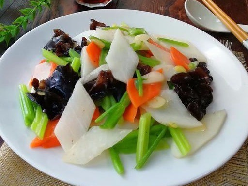 锅置火上,入油烧至六成热,放入蒜片爆香,加入山药、西芹、胡萝卜、木耳均匀翻炒片刻,加盐、鸡精、香油即可。