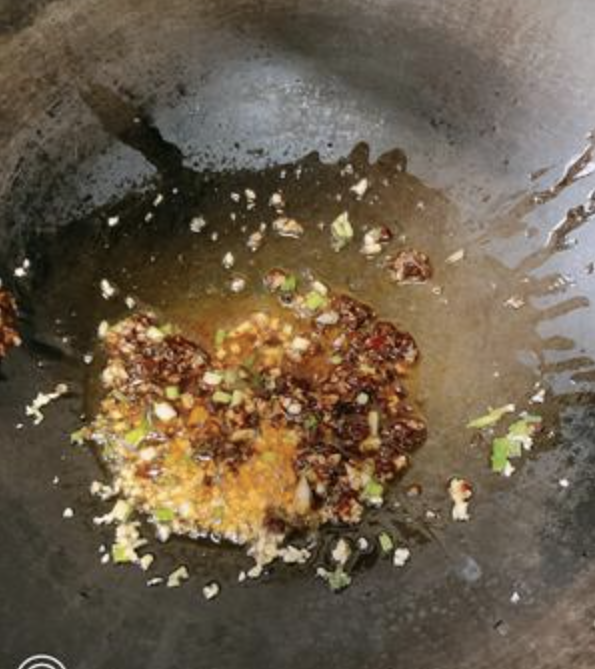 锅中倒入油,葱姜蒜末炒香,然后加入豆瓣酱炒匀,加入牛肉酱继续炒匀