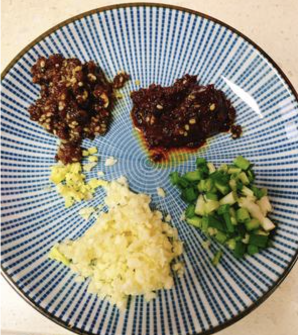 康源牛肉酱一大勺,郫县豆瓣酱一大勺,葱姜蒜末、豆腐切好备用
