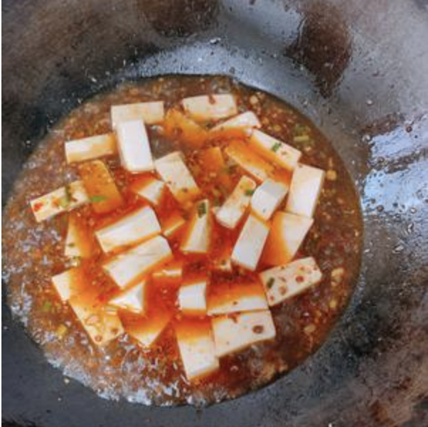 倒入切好的豆腐,期间用锅铲将汤汁浇在豆腐表面,反复2-3分钟