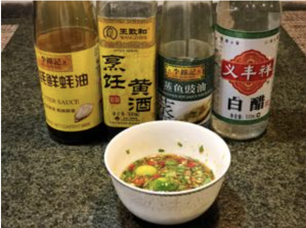 煮鸡肉的过程中可以制作蘸料,准备朝天椒、葱、姜、蒜、香菜切末,小青金桔对切。加入蚝油、黄酒、蒸鱼豉油、米醋,拌匀,挤入青金桔汁,具体的辣度和咸淡可以根据自己的口味调整。