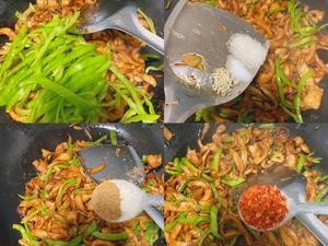 翻炒均匀后下入青椒丝,加如图少许的盐、鸡精、一勺白糖、一勺孜然、一勺辣椒粉,继续翻炒两分钟左右即可。