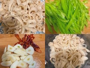 蒜瓣切片,辣椒切丝。面筋焯水、开水下锅,水再次烧开捞出沥干水份