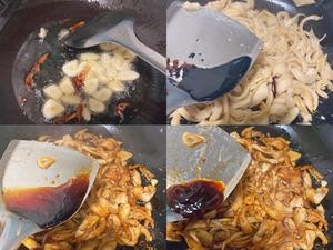 锅中热油先下入辣椒丝和蒜瓣炒香,接着下去沥干水的面筋。大火翻炒1-2分钟调味:加半勺老抽上色、半勺蚝油、半勺生抽。